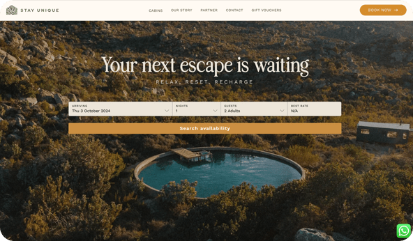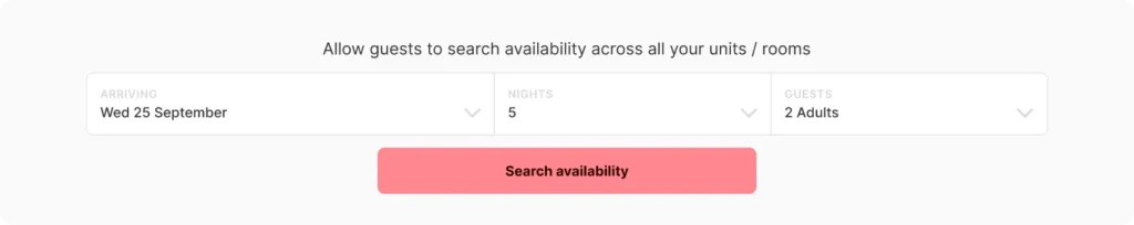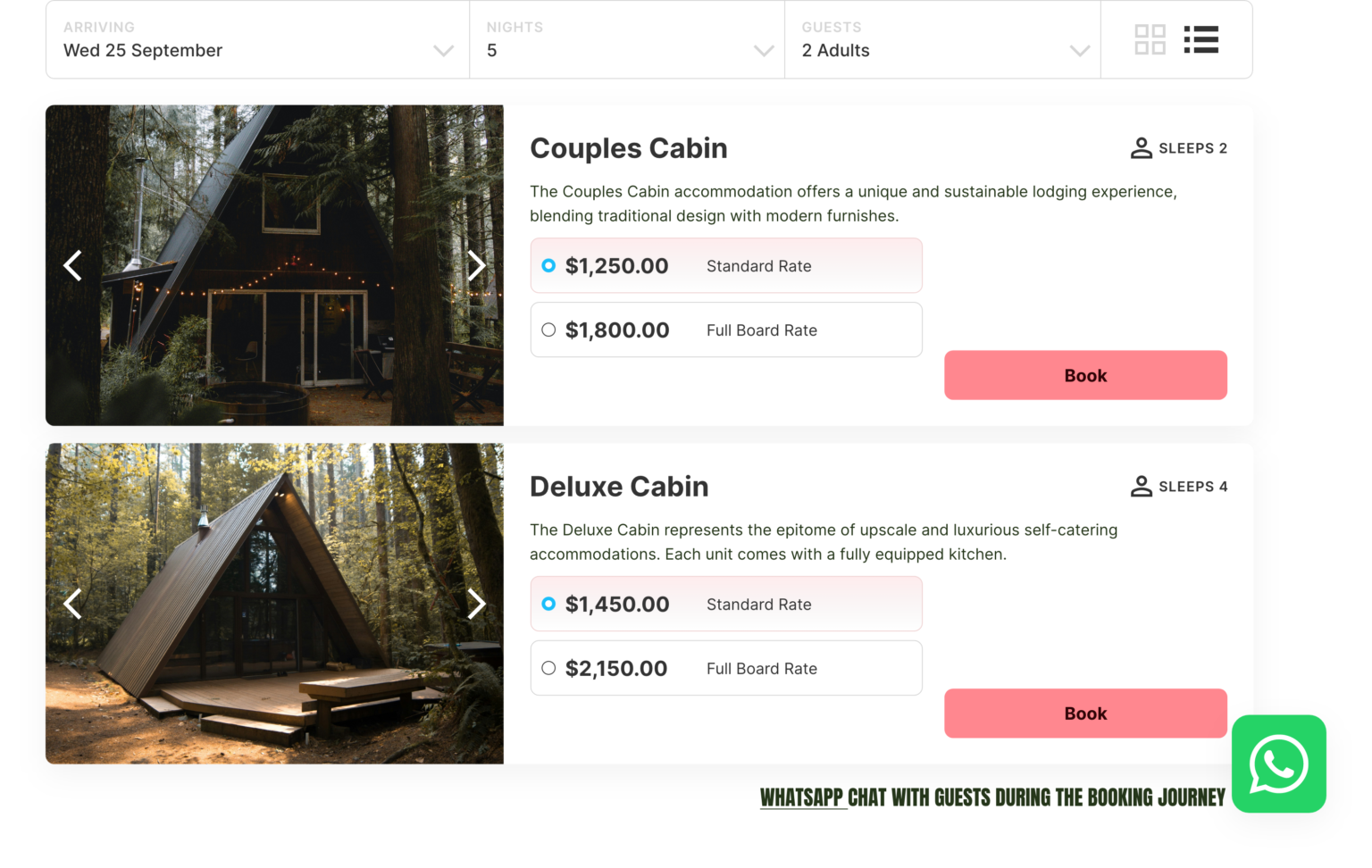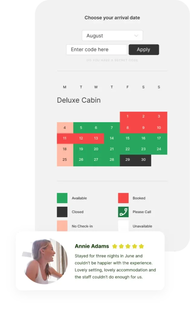 Or you can get creative with the way you direct guests into booking, by adding a fly-out menu of availability if users click on a link like the button below. The options are endless with our easy-to-implement booking components.