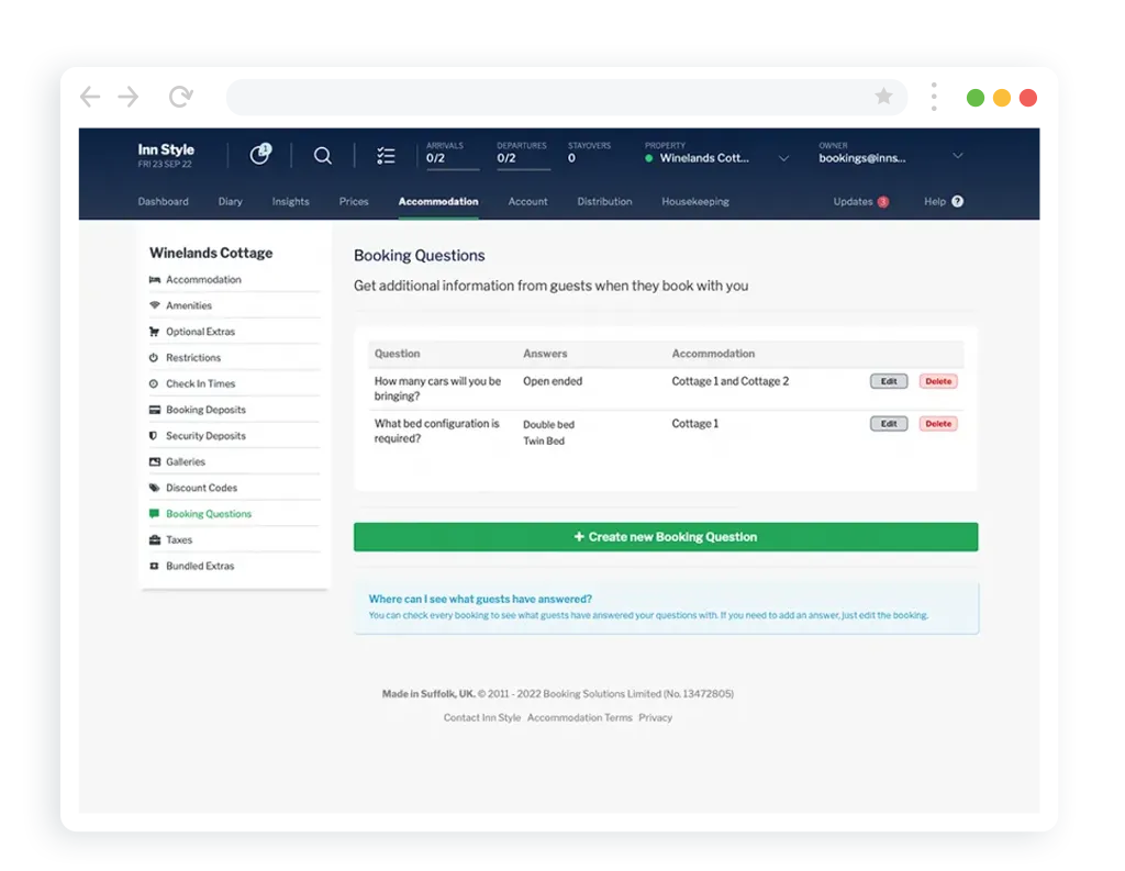 If your accommodation requires specific details from the guest upfront, such as vehicle registration or check-in time, this is easy to capture with Inn Style’s Booking Questions feature.