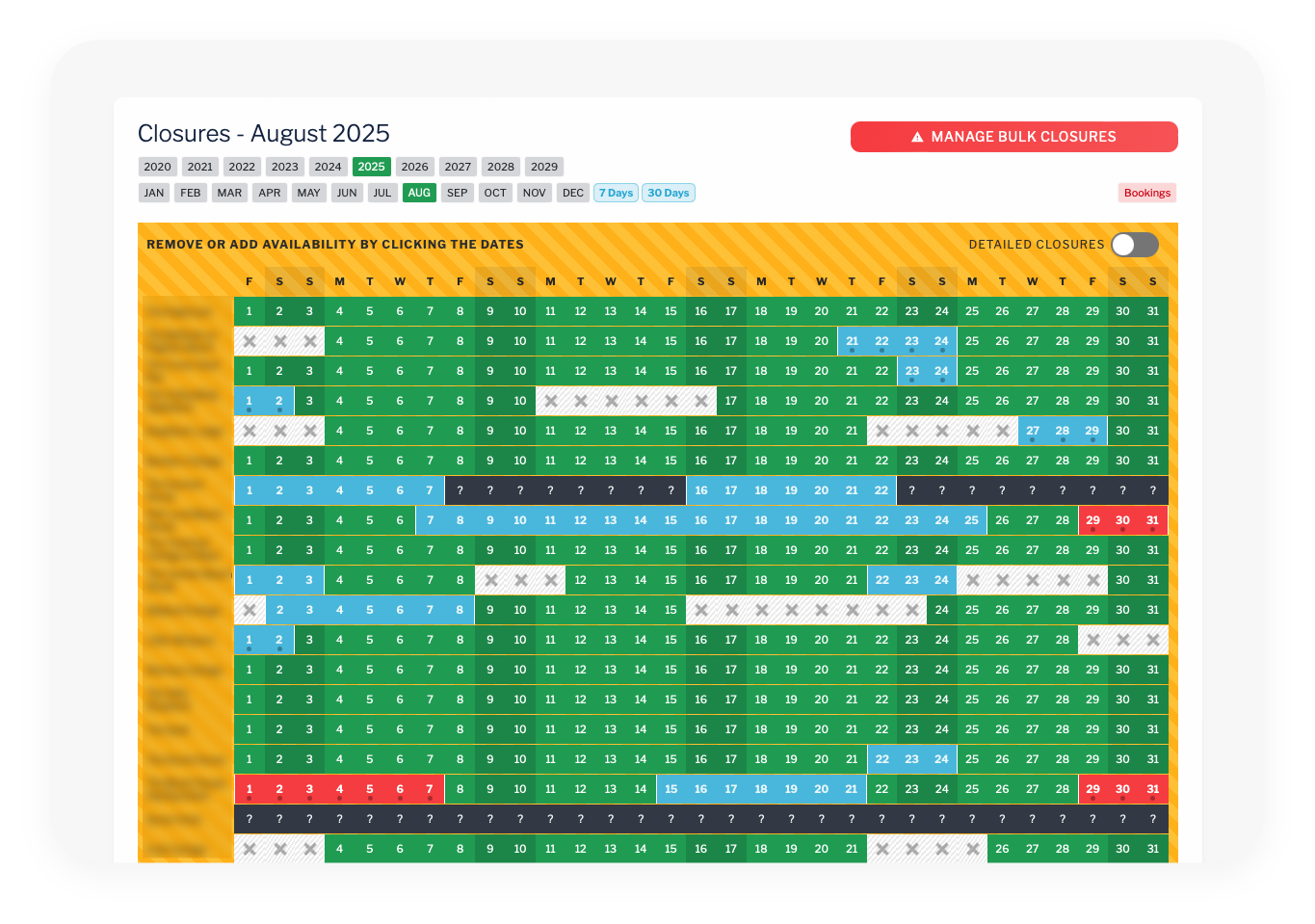 Head to the Dashboard and click Closures. Click on the days you want to close. Simple. You can also click the closed dates to re-open them. If you’d like to return to the normal Bookings Mode, simply click the red Bookings button.