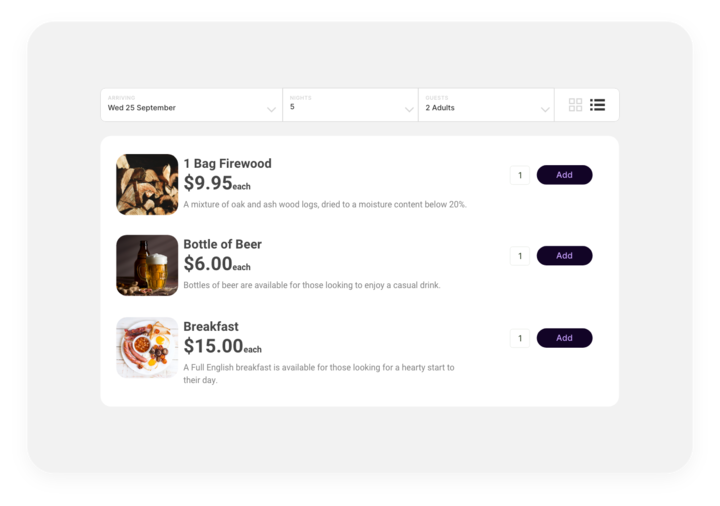 Easily allow guests to enhance their experience at your establishment buying anything from firewood to an activity that’s unique to your accommodation.