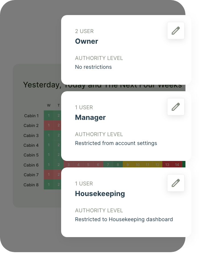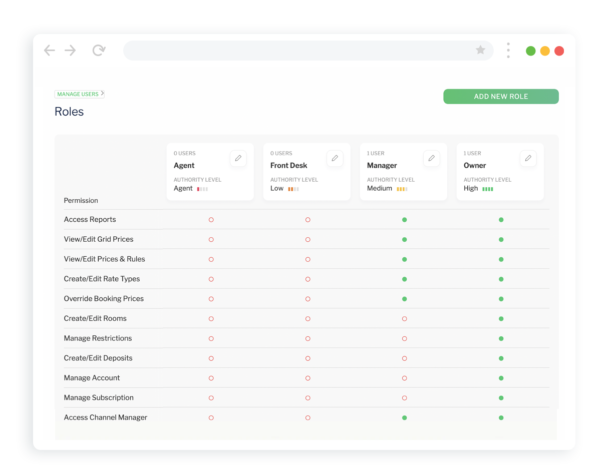 A Manager can access most parts of your account, with the exception of payment methods, accommodation descriptions, deposits, restrictions, managing users, and subscription information.