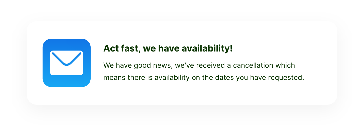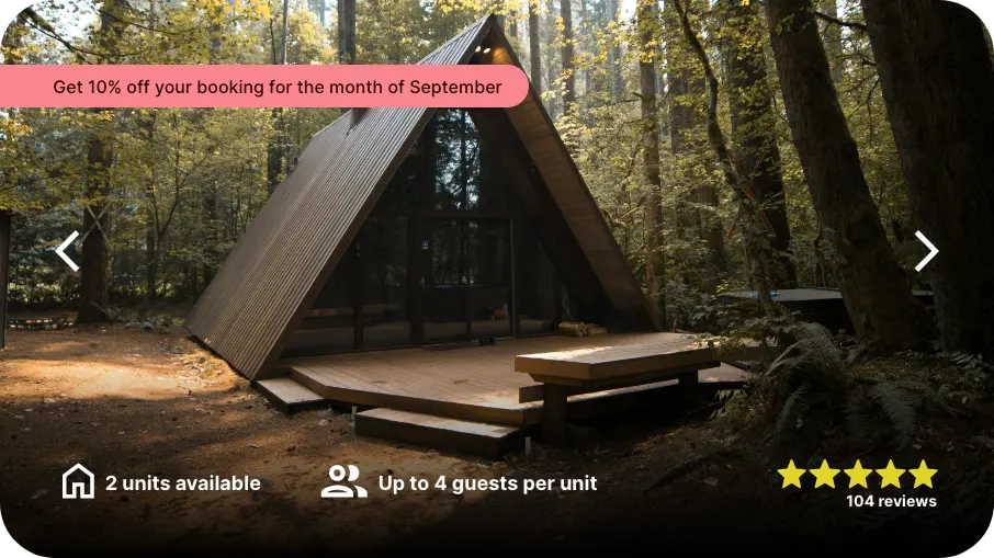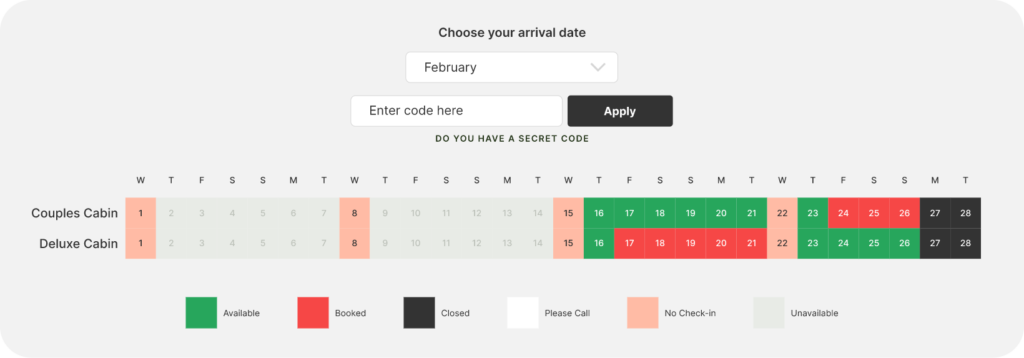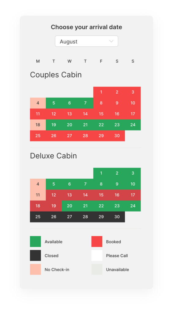 Or you can get creative with the way you direct guests into booking, by adding a fly-out menu of availability if users click on a link like the button below. The options are endless with our easy-to-implement booking components.
